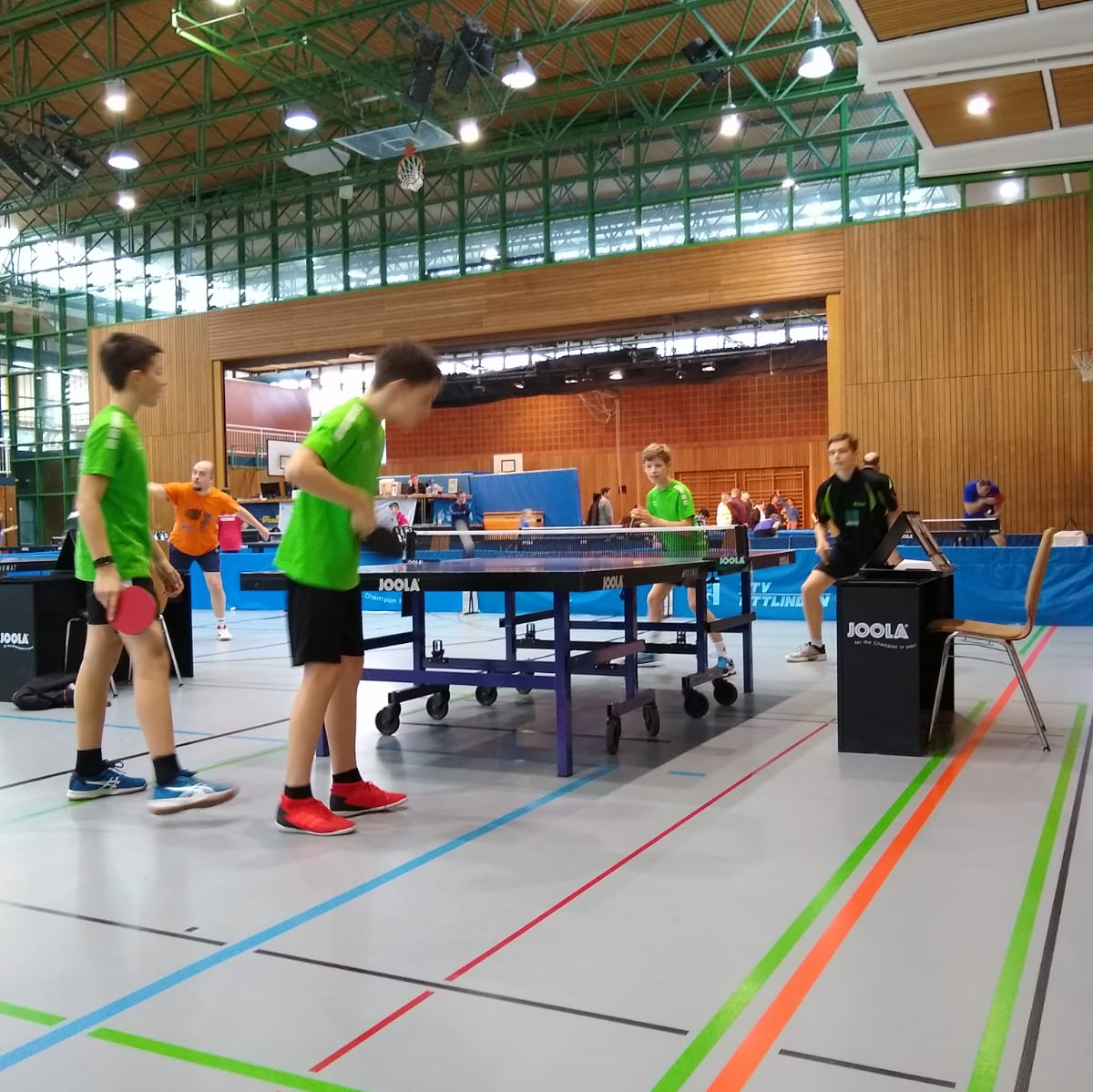 Die Mädels konnten ihr Doppel in vier Sätzen gewinnen, die Jungs benötigten sogar nur drei Sätze dafür. Das ist umso schöner, da wir nur wenig Zeit davor hatten, das ins Training einzubauen. Johanna kostete ihre ersten Ligaspiele von aus und ging in beiden in den fünften Satz, das sie je einmal knapp gewann und knapp verlor. Arsenij, Elena und Hugo gewannen je einmal in drei und einmal in vier Sätzen.